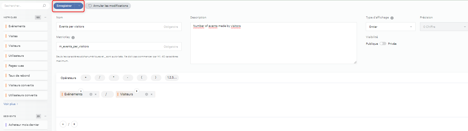 After saving it, this metric is now available in your Piano Analytics ressources: