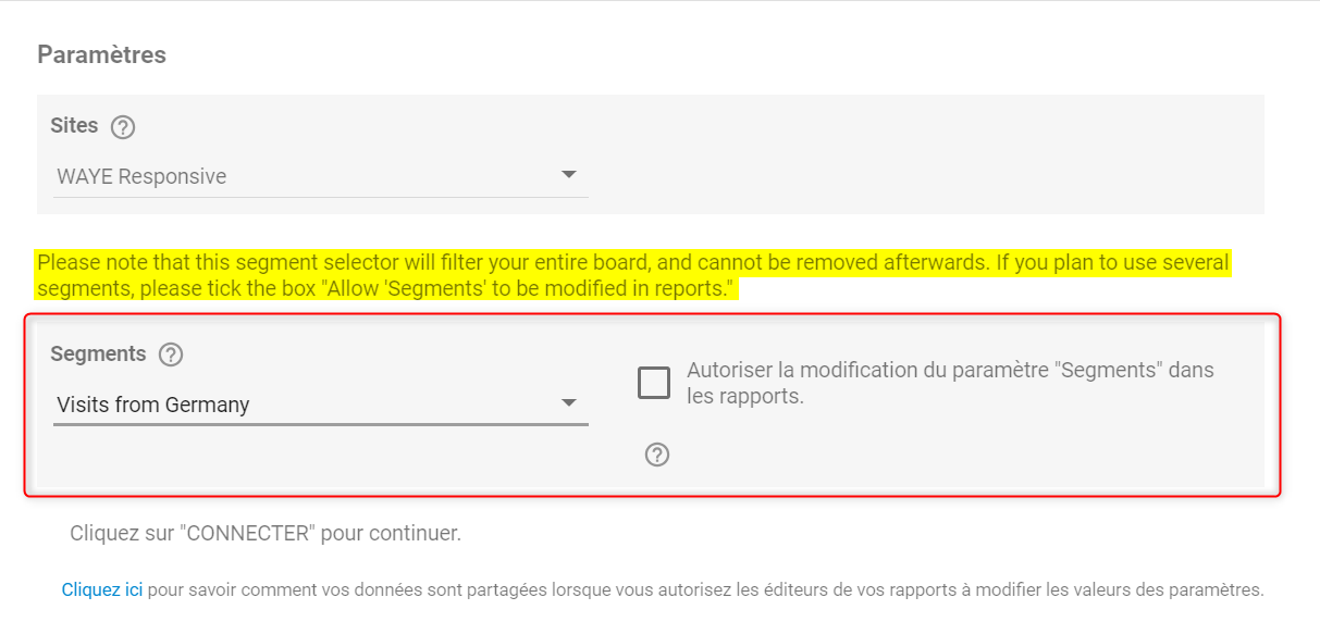 Selecting a segment from this configuration menu will apply that segment to your entire Looker board and cannot be removed afterwards. If you plan to apply different segments to several boxes in your report, please leave the selection empty and check the “Allow ‘Segments’ to be modified in reports” box: