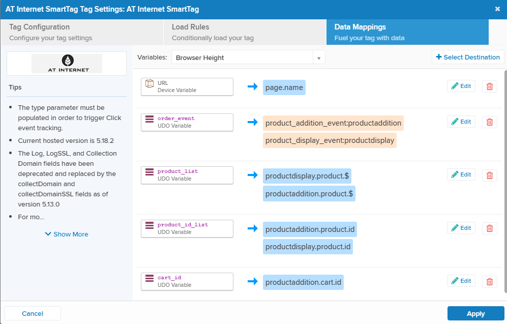 You can then configure the Piano Analytics tag (site number, collection domain, etc.), the tag loading rules (on all pages, on specific pages, etc.) and map the variables previously defined in the Data Layer.
