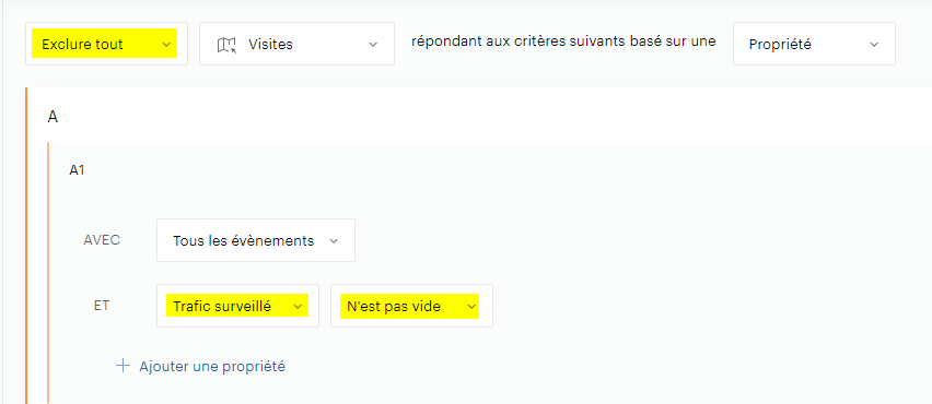 Toutefois, si vous souhaitez exclure ce trafic de certaines de vos analyses, vous pouvez créer un segment basé sur la propriété "Trafic surveillé" excluant les visites où la propriété n'est pas vide.