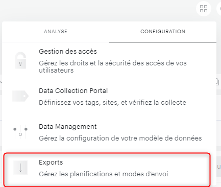 Pour cela, vous pouvez vous rendre dans l'interface "Exports" disponible dans le menu des applications comme montré ci-dessous :
