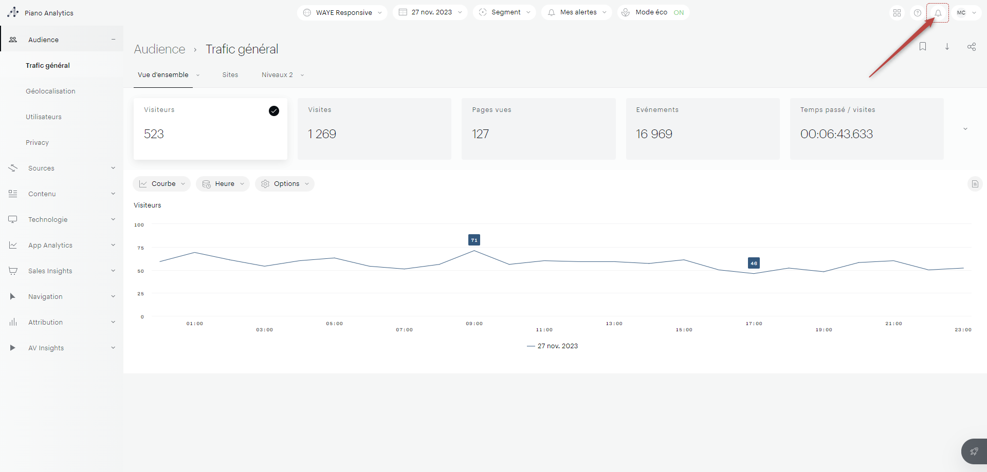 Pour accéder à toutes les communications concernant Piano Analytics, vous devez vous rendre sur Explorer puis cliquer sur l'icône en forme de cloche en haut à droite :