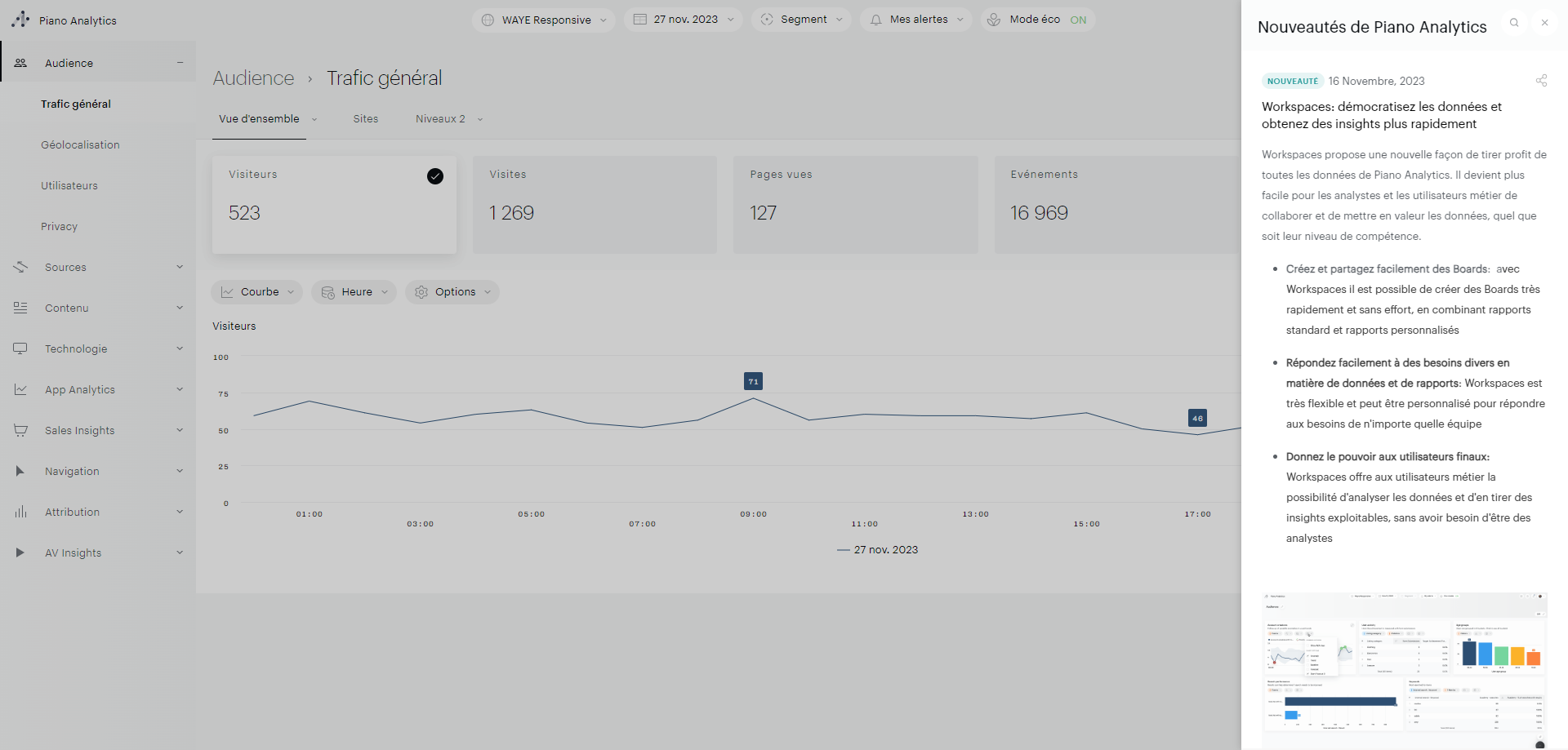 Cela affichera le panneau latéral contenant les nouveautés, où vous trouverez les dernières nouvelles concernant le produit, les communications et les annonces, vous permettant de découvrir, entre autres, nos dernières fonctionnalités :
