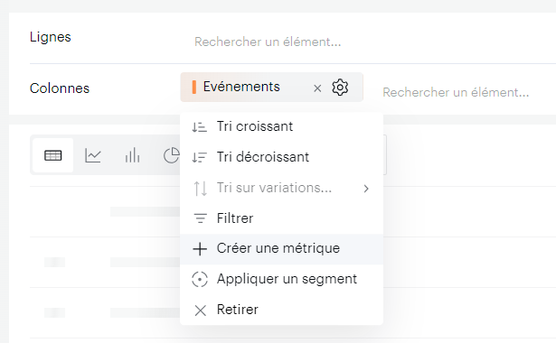 Pour connaître ce chiffre, créez une métrique personnalisée à la volée qui divisera le nombre d'événements par le nombre de visites ou de visiteurs selon votre besoin. Pour cela, ajoutez la métrique "Événements" à votre analyse, et cliquez sur "Créer une métrique" :