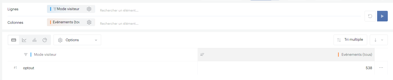 Maintenant que vous connaissez la moyenne d'événements par visite ou visiteur pour la période choisie, il vous faudra observer le nombre d'événements générés en optout. Créez alors un nouveau rapport avec la propriété "Mode visiteur" et la métrique "Événements (tous)", en filtrant votre propriété sur la valeur "optout" :