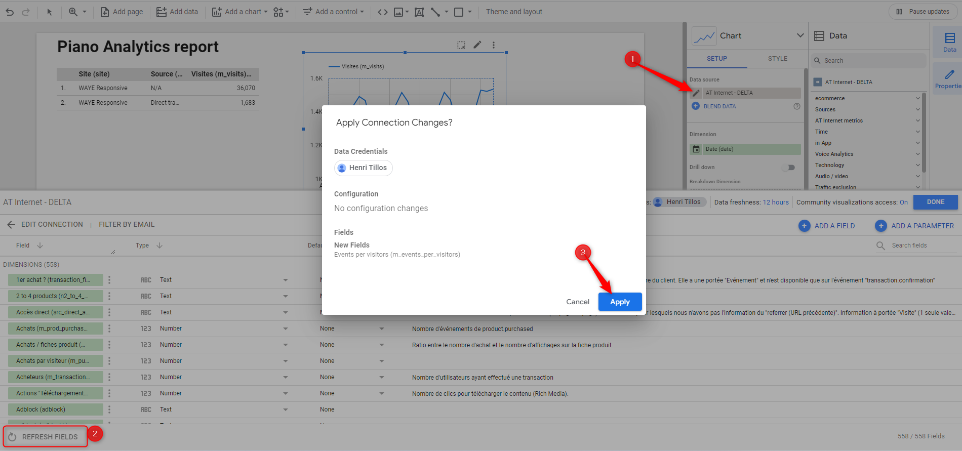 Dans Looker Studio vous devrez rafraichir la source de données Piano Analytics pour intégrer la métrique personnalisée que vous venez de créer. Pour ce faire vous devez cliquer sur le crayon d’édition de la source (volet de droite), ensuite vous cliquez sur le bouton de rafraichissement des données (en bas à gauche) et enfin vous devez appliquer les changements.
