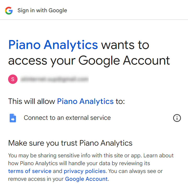 Afin de pouvoir fonctionner correctement, Looker Studio demande l’autorisation d’utiliser le connecteur Piano Analytics. Vous devez alors autoriser l’application Piano Analytics via l’authentification Google.