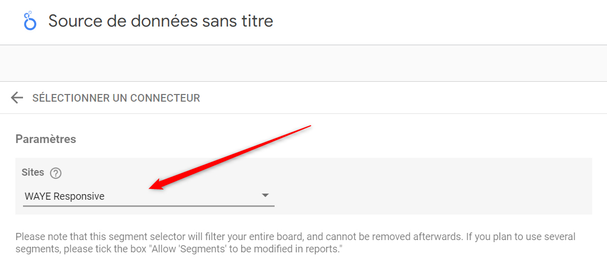 La sélection d'un segment depuis ce menu de configuration appliquera ce segment à l'ensemble de votre board Looker et ne pourra être enlevé. Si vous prévoyez d'appliquer différents segments à plusieurs boites de votre rapport, veuillez laisser la sélection vide et cocher la case "Autoriser la modification du paramètre "Segments" dans les rapports":
