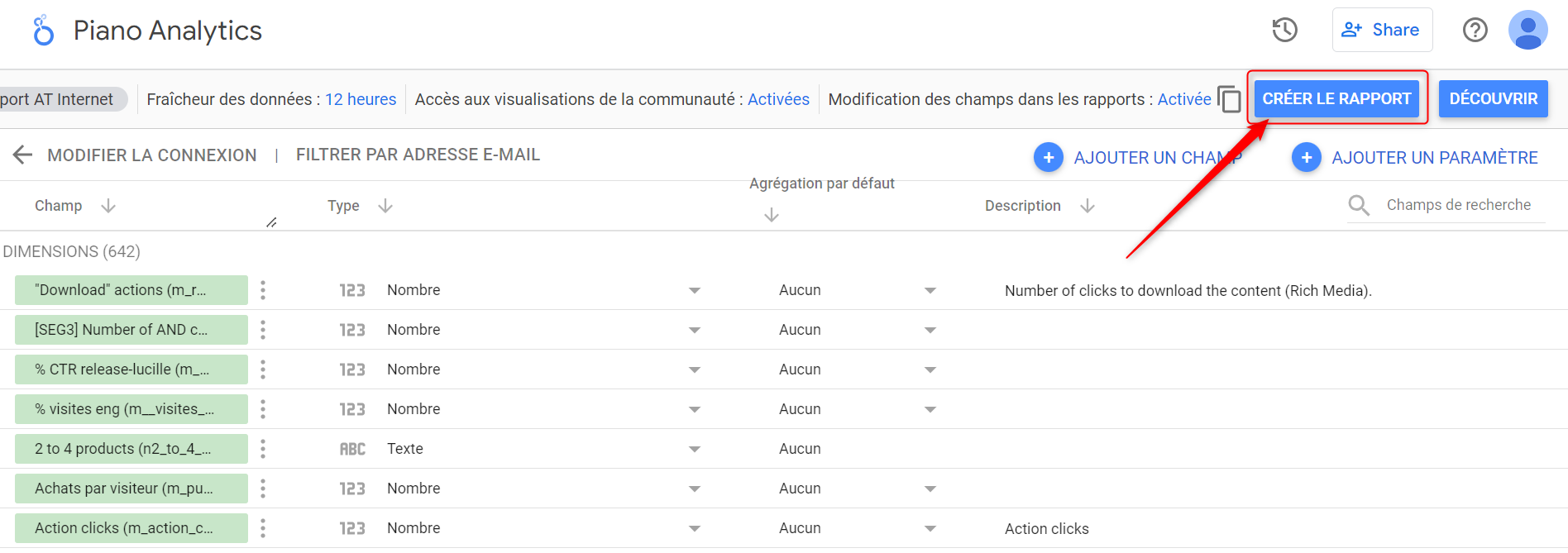 Source "Piano Analytics (AT Internet)": connecteur développé par notre partenaire Supermetrics pour leurs clients, basé sur l'API v3, mais qui ne permet pas d'importer propriétés et métriques personnalisées.